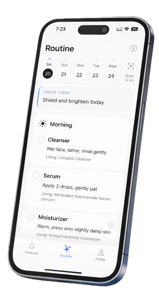 Get a daily AM & PM skincare routine tailored to your skin type — oily, dry, sensitive, or combination. Ingredient-aware guidance that adapts to your needs.